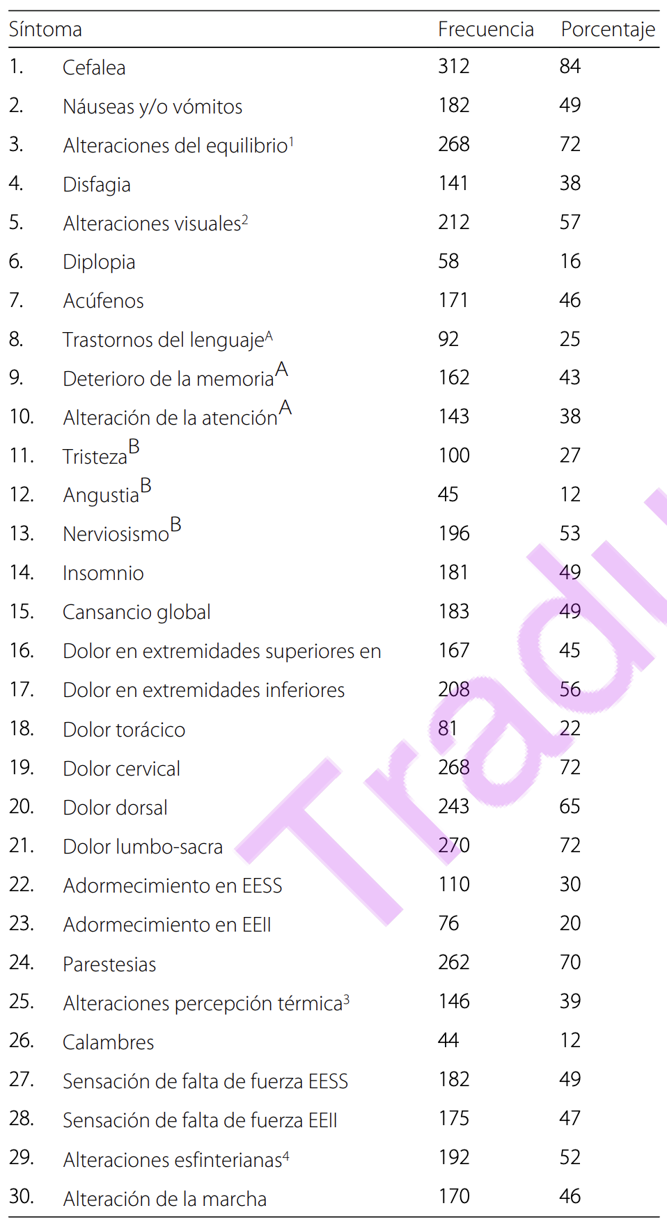 Taula I. Freqüència dels símptomes en 373 pacients amb EF/SNCV. (The Filum disease and the Neuro-Cranio-Vertebral Syndrome: definition, clinical picture and imaging features, Royo et al., BMC Neurology 2020).