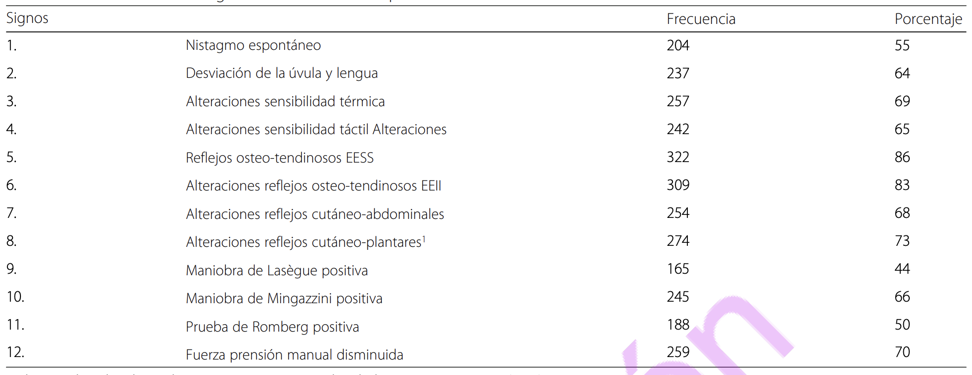 Taula II. Freqüència dels signes en 373 pacients amb EF/SNCV. (The Filum disease and the Neuro-Cranio-Vertebral Syndrome: definition, clinical picture and imaging features, Royo et al., BMC Neurology 2020).