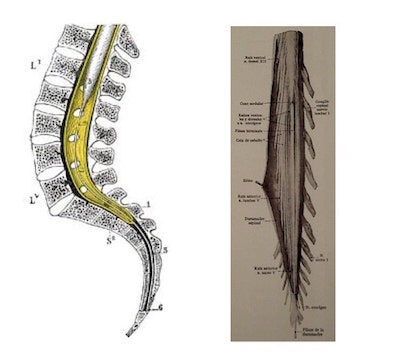 Fig. 2 y 3 El Filum Terminale, a l’esquerra, secció sagital de la columna lumbo-sacre-coccígia; a la dreta, con medul·lar amb l’obertura de la duramàter, arrels nervioses lumbosacres o cua de cavall.