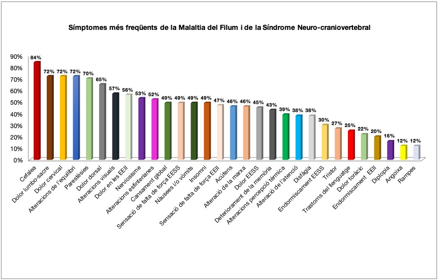 En el Gràfic I reportat, es mostren els símptomes en una mostra de 373 pacients amb EF i SNCV. Podem observar com, juntament amb els més típics i coneguts de l’Arnold Chiari I – cefalea i marejos, dolors de la columna vertebral, parestèsies, cansament, acúfens, disfàgia – i de la Siringomielia idiopàtica – alteracions de l’equilibri, dolors a les extremitats, alteració de la marxa, alteració de la percepció tèrmica – hi ha altres símptomes significativament freqüents en el percentatge: nerviosisme (53%), alteracions dels esfínters (52%), insomni (49%), deteriorament de la memòria (43%), alteració de l’atenció (38%), depressió (27%), trastorns del llenguatge (25%), diplopia (16%), rampes (12%).