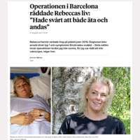 此后瑞贝卡的病情快速恶化,瑞典当地的医生建议她立即接受减压手术,但是因为减压手术的高风险,让她开始上网寻求其他的解决方案。“我找到了巴塞罗纳研究所,他们有不同的治疗方案。”瑞贝卡说。在她和报社的面谈中,她提到,在研究所手术前的一周,她开始出现严重的平衡、视力、听力、呼吸和吃饭问题。“手术的前一晚我完全无法入睡,因为我好害怕我再也就醒不过来了”。不过在研究所手术完没多久,瑞贝卡说:“感觉好像有什么不一样…我可以转动我的头了,我的脖子不再那么的紧了。”报导中提到瑞贝卡在手术后5年期间,一直没有间断的进行康复治疗和心理治疗。她解释她会向图书馆借字体大的童书来练习阅读和手部的精细动作,练习手写字,自己做手工,甚至最后她还加入了踏青社。最后在2020年年底,她终于又回到了工作岗位做半天工。