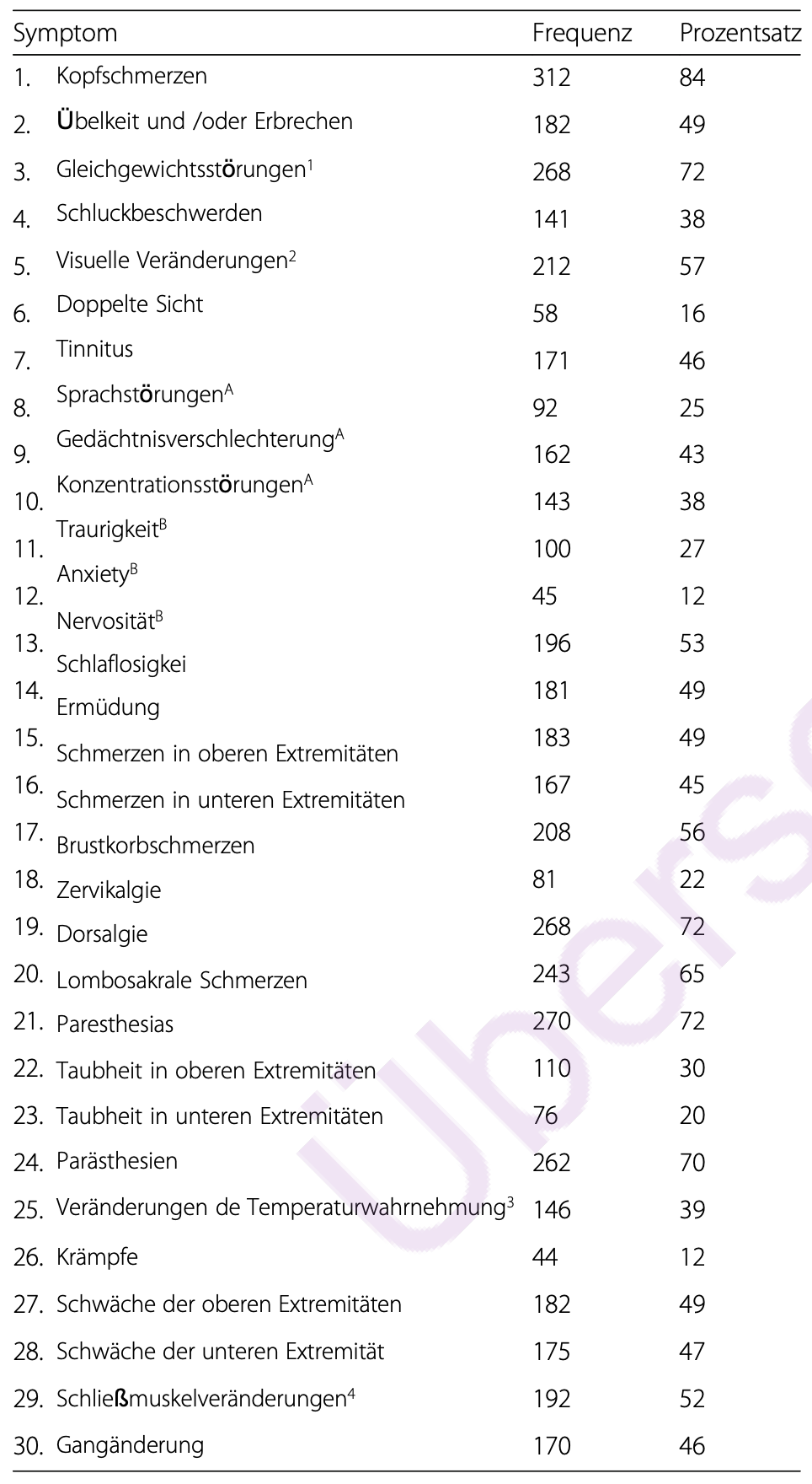 Tabelle 1. Häufigkeit der Symptome bei 373 Patienten mit Filum-Krankheit/Neuro-Kranio-vertebralem Syndrom. (The Filum disease and the Neuro-Cranio-Vertebral Syndrome: definition, clinical picture and imaging features, Royo et al., BMC Neurology 2020).
