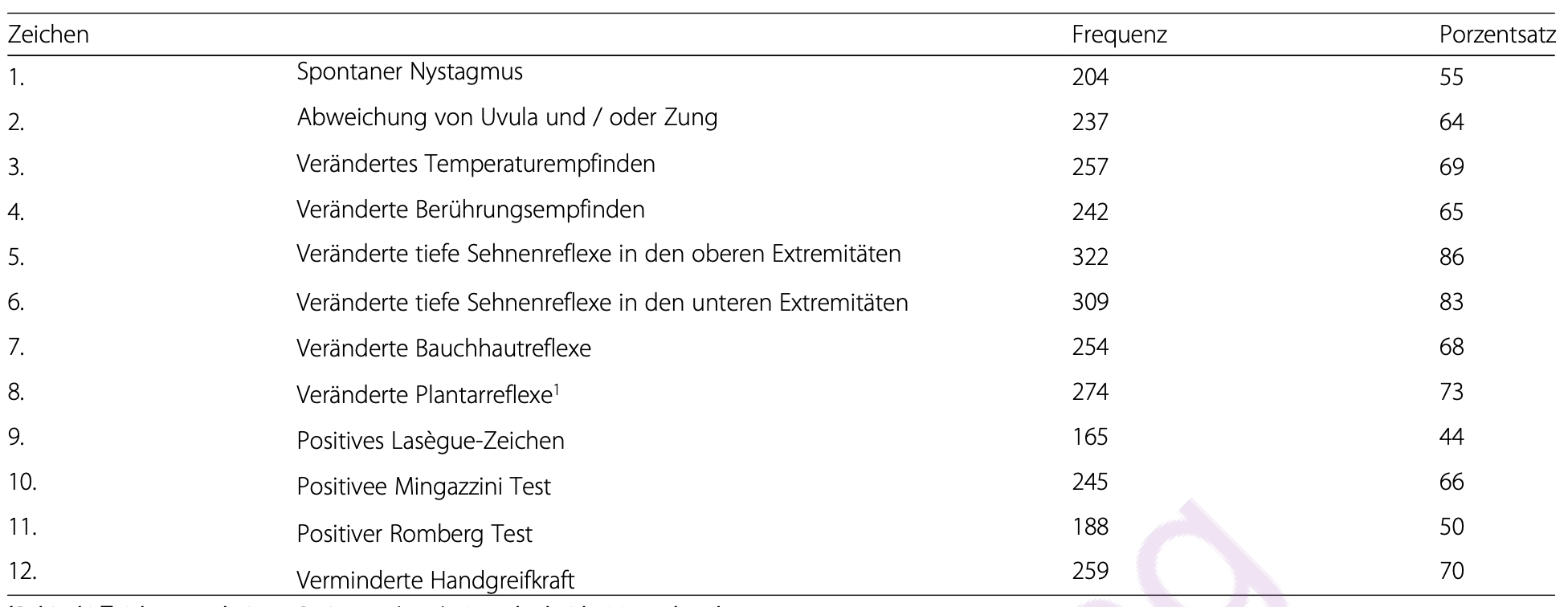 Tabelle 2. Häufigkeit der klinischen Zeichen bei 373 Patienten mit Filum-Krankheit/Neuro-Kranio-vertebralem Syndrom. (The Filum disease and the Neuro-Cranio-Vertebral Syndrome: definition, clinical picture and imaging features, Royo et al., BMC Neurology 2020).