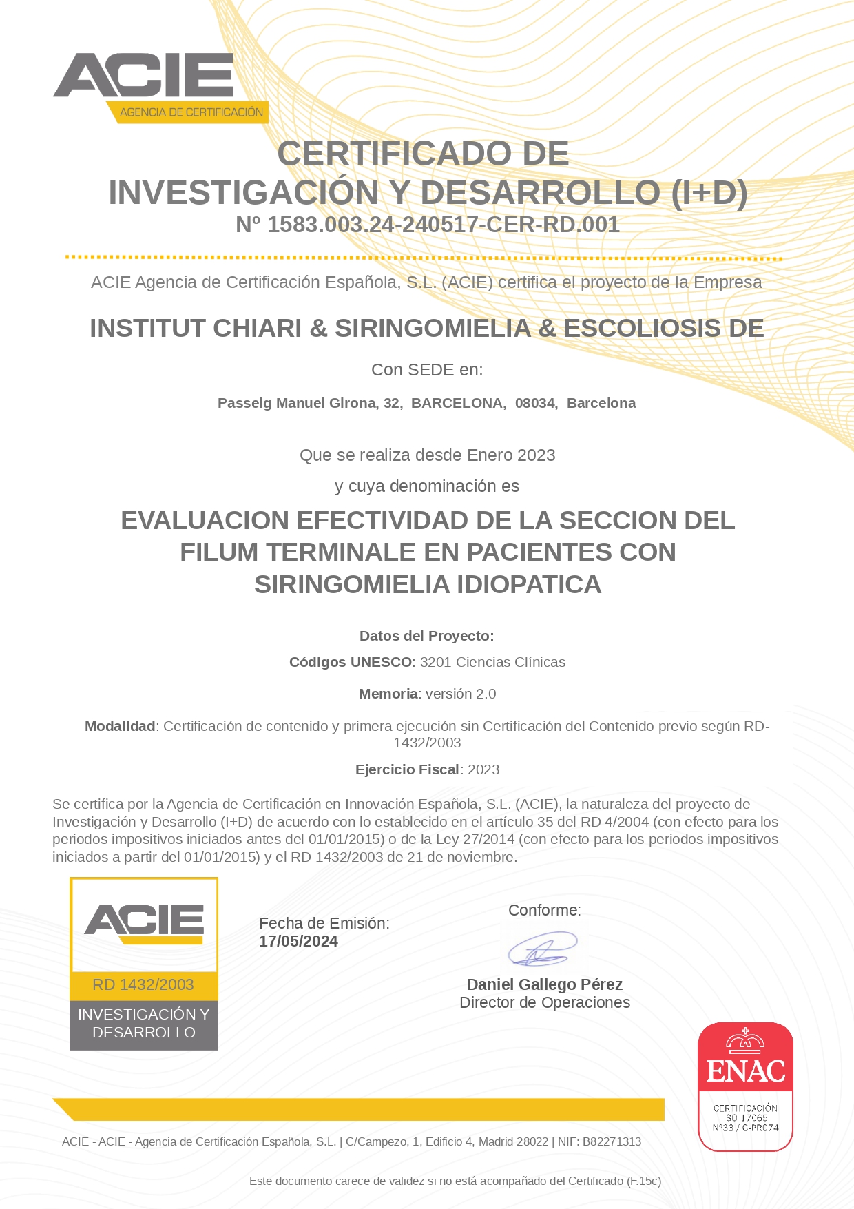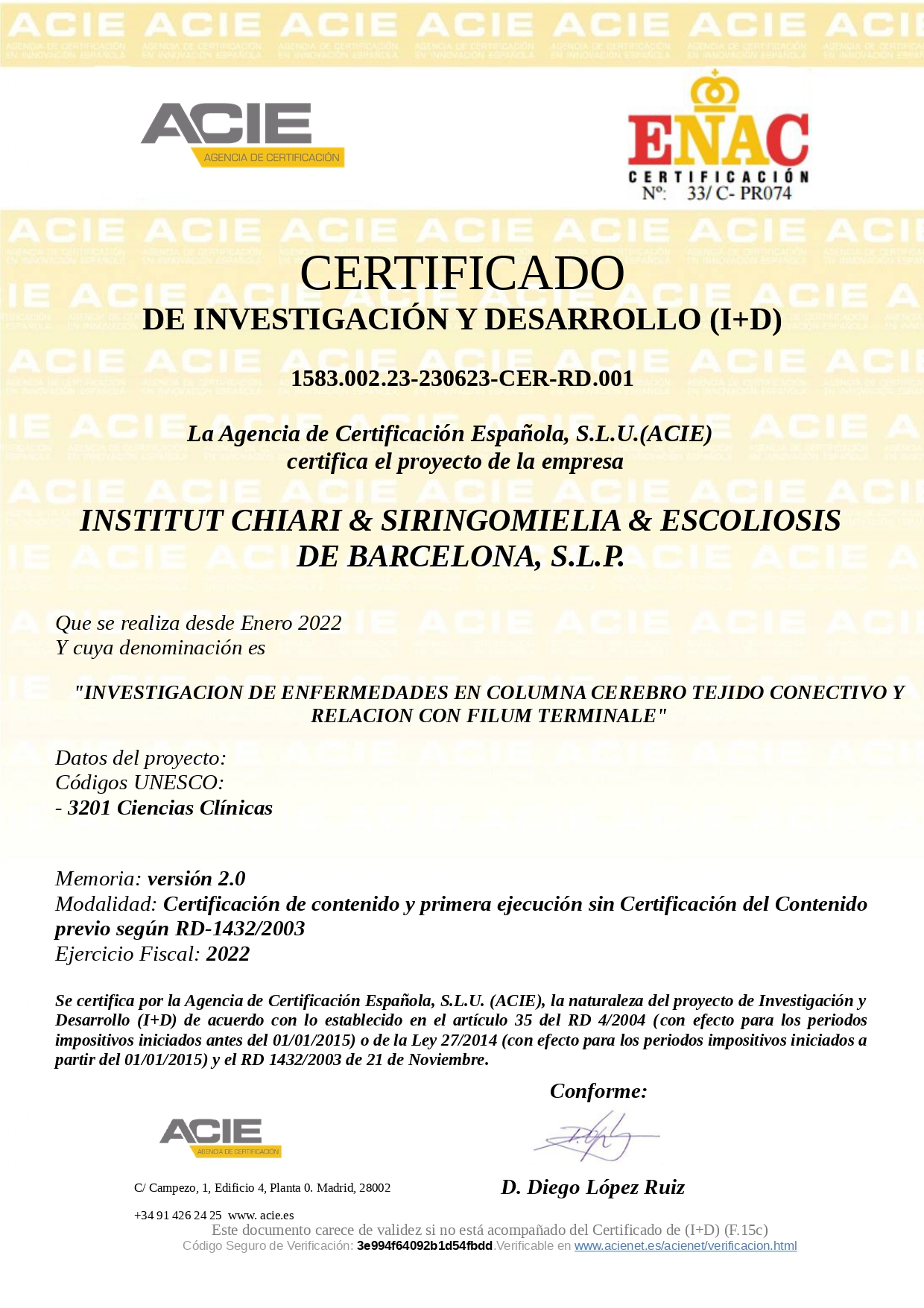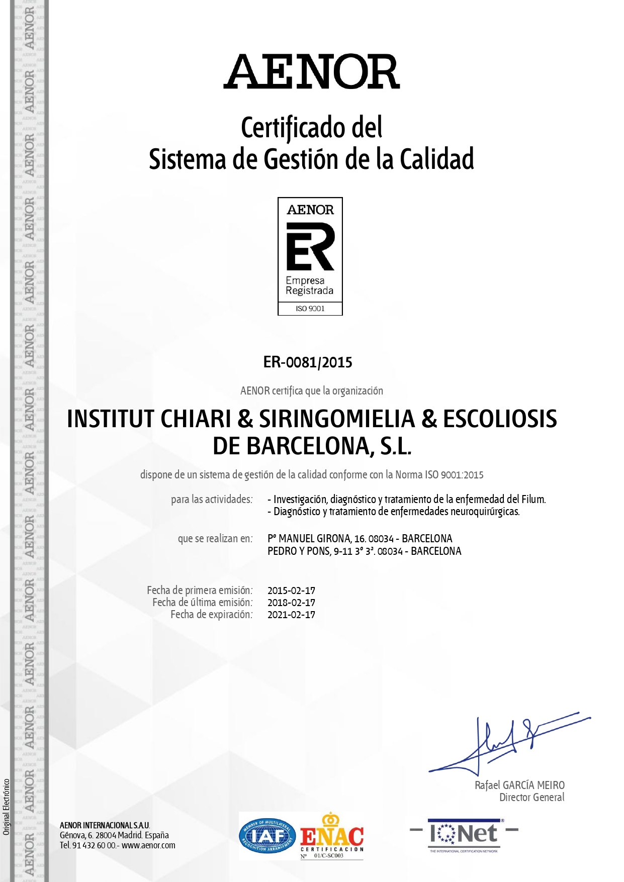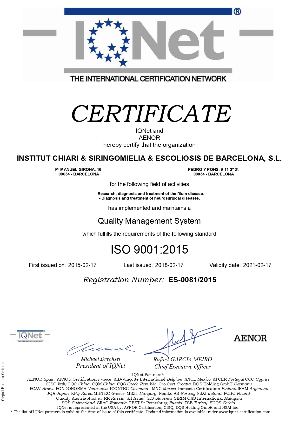Since its foundation, the Institut Chiari & Siringomielia & Escoliosis de Barcelona (ICSEB) has achieved accreditations and certifications through the development and continuous improvement of its work process.