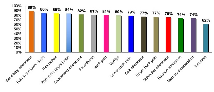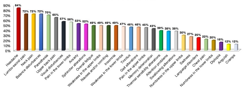 Graph I shows the symptoms reported in a sample of 373 patients with FD and NCVS. Along with the most common symptoms of Arnold Chiari I , such as headaches, dizziness, back pain, paresthesias, fatigue, tinnitus, and dysphagia – and Idiopathic Syringomyelia , including balance alterations, limb pain, gait issues, and alterations in thermal sensibility, there are other frequently occurring symptoms in significant percentages: anxiety (53%), sphincter alterations (52%), insomnia (49%), memory deterioration (43%), attention issues (38%), depression (27%), language disorders (25%), diplopia (16%), and cramps (12%).