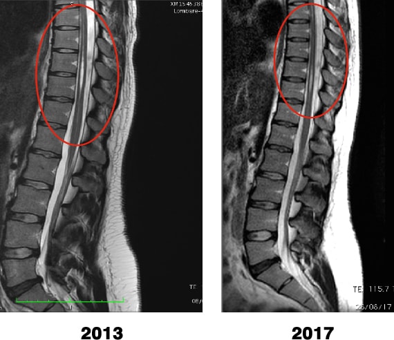 Syringomyelia cavity in the patient; comparison of the MR imaging from 2013 and 2017.