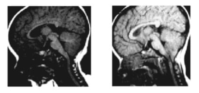 Figure 2.- Résonance magnétique (IRM) d’un patient à 8 et 20 mois, dans laquelle on peut observer un DAC apparu entre les deux IRM. Huang P. « Aquired » Chiari I malformation. J. Neurosurg 1994. Indiquant qu’en plus d’un élément génétique et héréditaire, il existe un facteur acquis.