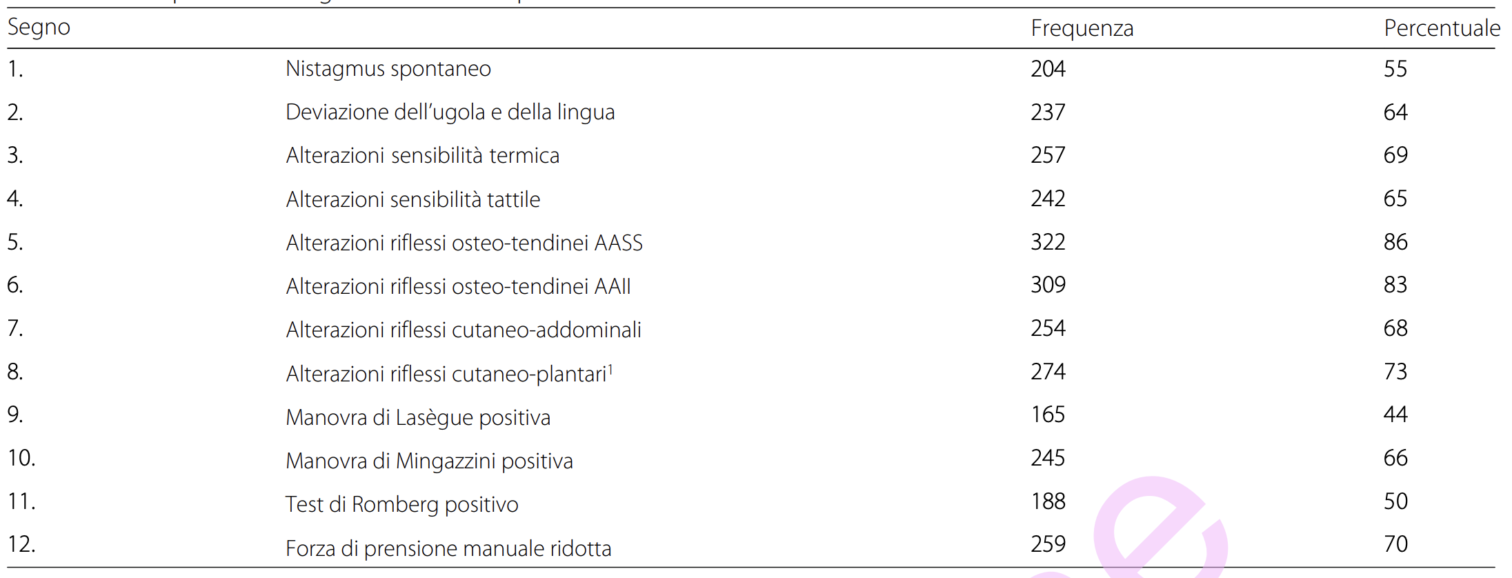 Tavola II. Frequenza dei segni in 373 pazienti con EF/SNCV. (The Filum disease and the Neuro-Cranio-Vertebral Syndrome: definition, clinical picture and imaging features, Royo et al., BMC Neurology 2020).