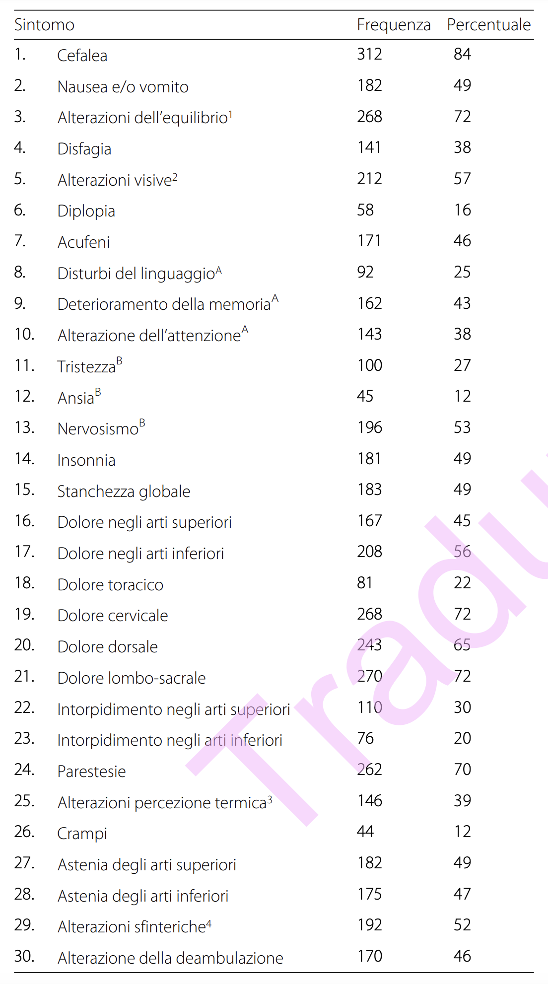 Tavola I. Frequenza dei sintomi in 373 pazienti con EF/SNCV. (“The Filum disease and the Neuro-Cranio-Vertebral Syndrome: definition, clinical picture and imaging features”, Royo et al., BMC Neurology 2020).