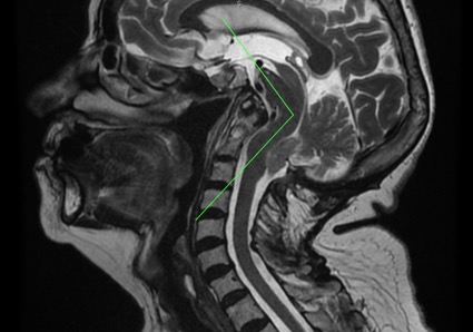 Fig.2- RM Cranio-cervicale sagittale con Inversione del Processo dell’Odontoide. Oltre a questo si rileva: Invaginazione basilare, Abbassamento delle tonsille cerebellari, Kinking del tronco cerebrale. Si noti l’aumento dello spazio sopra-cerebellare, evidenza a favore della teoria della trazione e contraria a quella malformativa da riduzione della fossa posteriore.