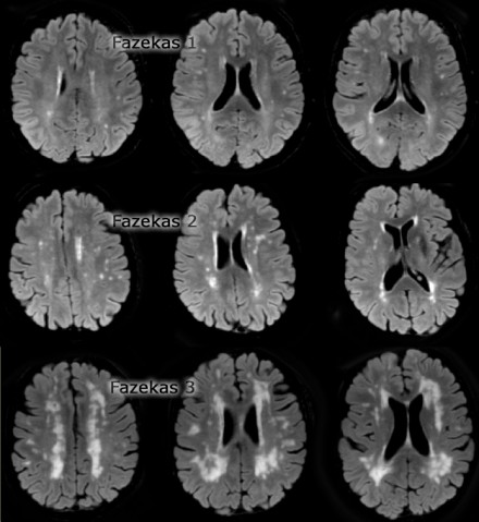 La scala di Fazekas (Fig.3), qualitativa, è la più usata per determinare la dimensione delle lesioni nella sostanza bianca nella IRM, e la sua classificazione è la seguente: