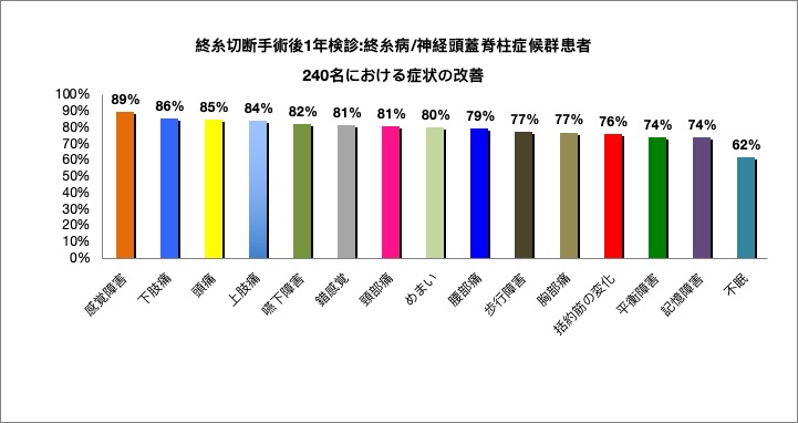 図2は、終糸システム®適用で行われた低侵襲治療の終糸切断手術から1年後の患者240名の症状の改善の結果を表しています。