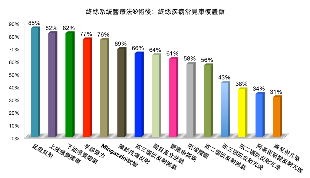 與醫學文獻紀載的其他手術成果比較,所有因為不同脊柱問題而接受我們手術治療的病患,他們的手術成果全是優於醫學文獻所紀載的手術成果。我們在工作造成的腰椎疾病手術上也都獲得相當優秀的成果。在小腦扁桃體下疝第一型、脊髓空洞症、脊柱側彎、顱底凹陷症、齒狀突惡化、腦幹扭結症方面,1000多個接受我們“終絲切斷”外科手術治療的病患,他們的手術成果也都相當優秀。